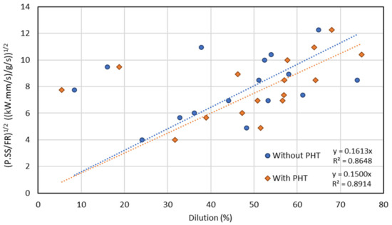 A similar analysis was performed in which the three analyzed processing parameters (Laser power—P, Scanning speed—SS, and Feed rate—FR) were merged in an empirical combined parameter P*SS/FR [16] and correlated with the dilution (Figure 10).