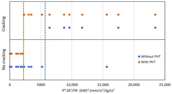 It was more challenging to find a complex parameter that would allow the processing conditions to be associated with the appearance of cracks. This relationship was achieved when using P4·SS2/FR as a complex parameter (Figure 11). The limit values of 2000 and 5000 (kW)4·(mm/s)2/(g/s) allow the production of sound clads in samples with and without PHT, respectively.