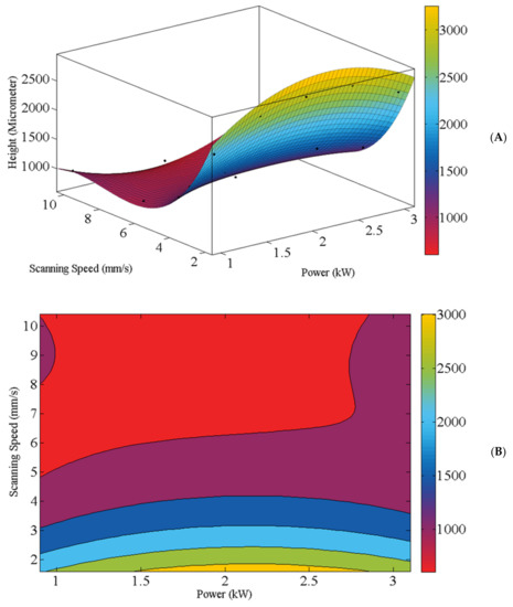 (A) The best curved surface (R-square: 0.9908; Adjusted R-square: 0.9539; RMSE: 0.1347) and (B) contour plot for the height (in micrometers) of deposited clad regarding the combination of the laser power and scanning speed.