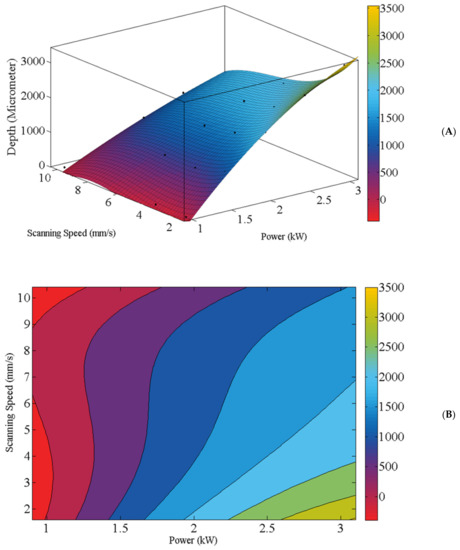 (A) The best curved surface (R-square: 0.9904; Adjusted R-square: 0.952; RMSE: 0.1674) and (B) contour plot for the depth (in micrometers) of deposited clad regarding the combination of the laser power and scanning speed.