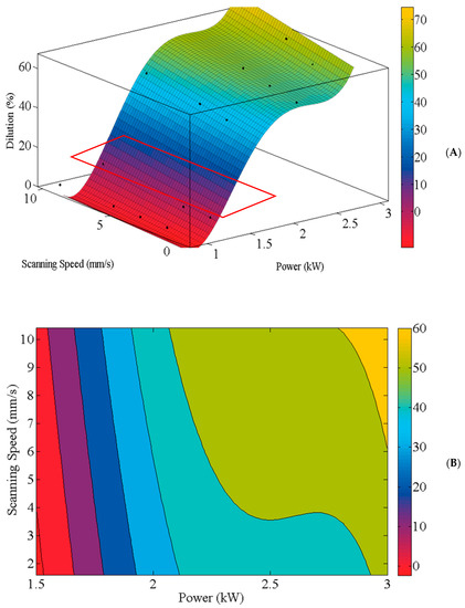 (A) The best curved surface (R-square: 0.9728; Adjusted R-square: 0.8641; RMSE: 0.347) and (B) contour plot for the dilution (in %) of deposited clad regarding the combination of the laser power and scanning speed.