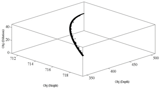 3D Pareto frontier of the three objective functions including depth, dilution, and height of clads, with a feed rate of 15 g/min and with 300 °C pre-heating.