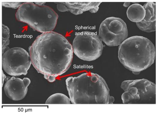 The powder raw materials with particle sizes of 20 to 56 µm (see Figure 1) were supplied by ECKA Granules Germany GmbH (Velden, BY, Germany). The powders had a relatively high sphericity, 0.8 ± 0.1, and a high roundedness, 0.8 ± 0.2. Sphericity is defined as the ratio of the particle surface area to the area of a sphere with the same volume, and roundness is defined as the ratio of the average radius of curvature of the corners of the object to the radius of the maximum inscribed circle [14]. This morphological property favors better flowability of the powder during the recoating operation, more efficient particle packing, and formation of a highly dense powder bed, which yields a superior density, surface finish, and dimensional accuracy of the final fabricated component [15]. However, a few teardrop-shaped powder particles, as well as small satellites, were also observed, which slightly reduced the flowability of the powder [16].