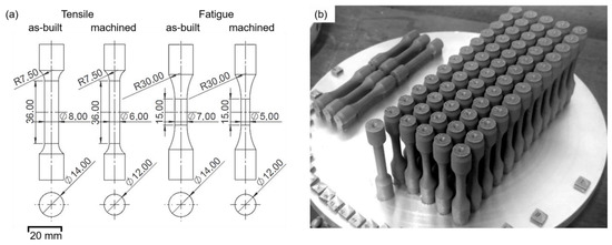 (a) Geometries of tensile and fatigue specimens before and after machining. (b) The position of specimens on the build-platform.