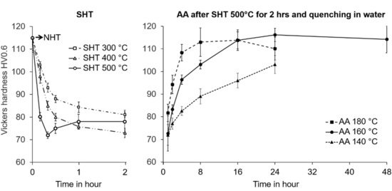 Microhardness evolution of the alloy during SHT at 300, 400, and 500 °C followed by AA at 140, 160, and 180 °C.