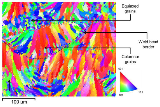 A relatively high hardness, i.e., 115 HV, of AlSi10Mg alloy measured in NHT condition already shows an enhancement compared to that of its conventionally manufactured counterparts, 63 HV [4], which agrees with the data already published [23]. This observation can be justified by the size of columnar and equiaxed grains, in the range of 10 to 70 µm, compared to grain sizes of the order of a few hundred microns in conventionally cast AlSi10Mg [4]. Figure 5 shows the inverse pole figure (IPF) map of the α-Al matrix with a face-centered cubic crystal structure, which is the result of an EBSD analysis of the microstructure in the NHT condition. Despite the presence of equiaxed grains, much of the microstructure is composed of columnar grains with average length and thickness of 70 ± 5 µm and 10 ± 2 µm, respectively. Most columnar grains are oriented with their <001> crystal direction parallel to the build direction. Such a texture has been widely reported in PBF-LB/M-manufactured AlSi10Mg alloy and many other metallic alloys processed by PBF-LB/M [24,25]. It is reported that the morphology and crystal orientation of these columnar grains stay almost intact after solution treatment even at 530 °C for 6 h. Only a slight grain growth can occur [26,27]. This texture arises parallel to the heat extraction direction during columnar solidification of metallic alloys with cubic crystal structures [28]. Equiaxed grains with an average diameter of 8 ± 2 µm and a weaker texture than columnar grains can be observed near the borders of weld beads. The columnar zone is expected to have formed due to the rapid growth of grains with favorable <001> orientation parallel to the heat flow direction. In general, thermal gradient G and solidification rate R at the solid–liquid interface determine the grain morphology during solidification and the morphology transition from equiaxed to columnar [29,30]. In this study, the thermal gradient within the weld bead border, also known as hatch overlaps [31], was found to be as high as 106 K/m, and the solidification rate behind the weld bead had the same speed as the scanning speed, 1.3 m/s, which can explain the rapid growth of grains parallel to the heat flow direction. Both the thermal gradient and solidification rate were calculated based on Rosenthal’s theoretical solution of moving heat source [32] at liquidus–solidus region.