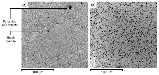Cross-sectional optical micrograph of (a) NHT and (b) HT specimens. The white arrow indicates the build direction.