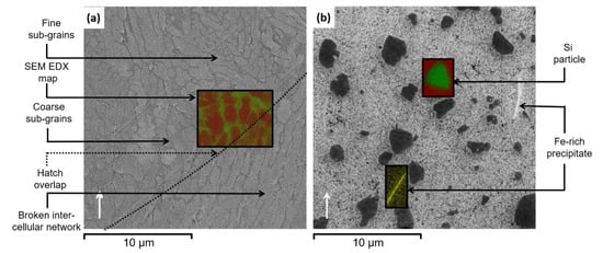 The microstructures in the NHT and HT conditions are shown in Figure 6 and Figure 7. In both figures, the white arrows indicate the build direction. As can be seen, hatch overlaps and the three distinct areas, which were visible in NHT condition with “fish scale” morphology [39,40,41], can hardly be identified in HT condition. The three distinct areas are fine subgrains of pro-eutectic (primary) α-Al in the center of the weld bead, larger subgrains on the border of the weld bead, and a heat-affected zone with a broken intercellular network. Similar results have been reported in several publications [38,42,43]. These hatch overlaps disappear through compositional and microstructural homogenization during SHT. The coalescence and coarsening of Si particles during the SHT, as implied from the microstructure in the HT condition, leads to the dissolution of Si-rich eutectic regions. Irregular-shaped Si particles with sizes in the range of 0.2 and 4 µm can clearly be observed in HT condition (Figure 7b). All these would imply the weakening of anisotropic microstructure and mechanical properties of the NHT PBF-LB/M material fabricated either parallel or perpendicular to the build platform. Moreover, several plate-like precipitates with a length of 4 ± 1 µm are distributed in the microstructure. SEM-EDX analyses indicated high concentrations of Fe in the precipitates. These precipitates are expected to be β-Al5SiF [36].