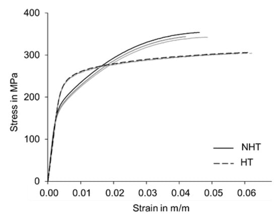 Engineering tensile stress–strain curves for the NHT and HT conditions.