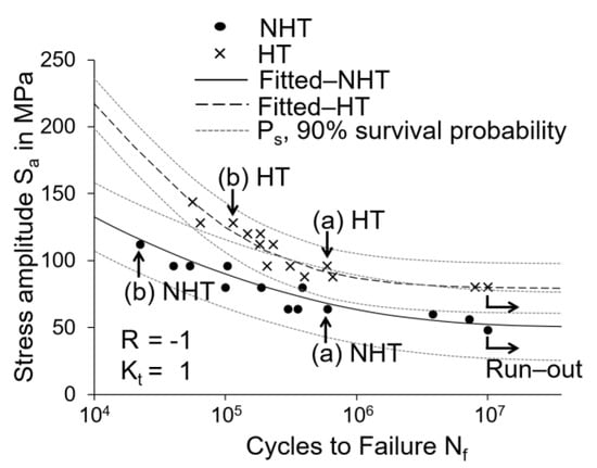 S-N curves for the NHT and HT conditions. All tests were performed at stress ratio R = −1 and stress concentration factor Kt = 1. Ps denotes the 90% survival probability. The four specimens selected for fractography are marked with letters a and b.