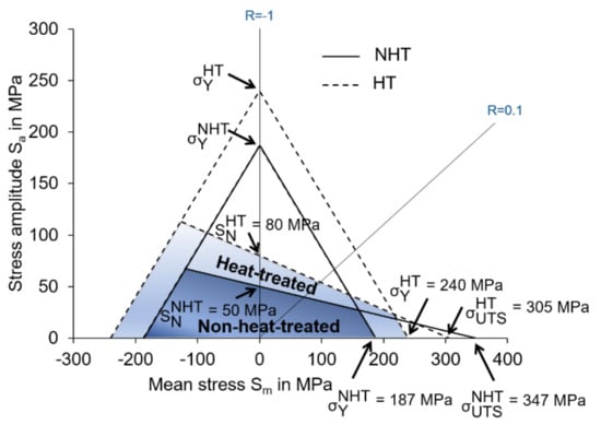 To obtain a complete picture of the influence of the increased yield stress after heat treatment on fatigue life, the modified Goodman method [51] was employed and the fatigue endurance diagram was plotted (see Figure 10). This method reduces the experimental effort by providing an estimate of the fatigue life at different R-values based on one set of measurements at R = −1. This form of representation enables the comparison of the results of this work with already published data based on measurements performed at different R-values. In Figure 10, the knowledge of mechanical properties under tensile loading conditions and SN under fully reversed cyclic loading in the axial direction is used to predict the fatigue performance of materials in NHT and HT conditions under cyclic loading conditions with nonzero mean stress (Sm). It is evident that despite a slight decrease in the ultimate tensile strength, the fatigue life region is expanded by 90% in the HT condition, which is due to the increase in the yield strength after heat treatment. It appears that the delayed onset of micro-deformation caused by the higher yield strength of the alloy in HT condition is the dominant factor controlling the fatigue strength. Moreover, the influence of heat treatment is more pronounced in the negative Sm range.
