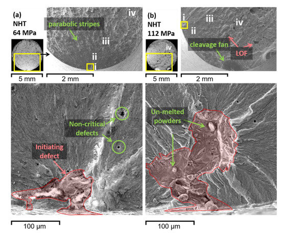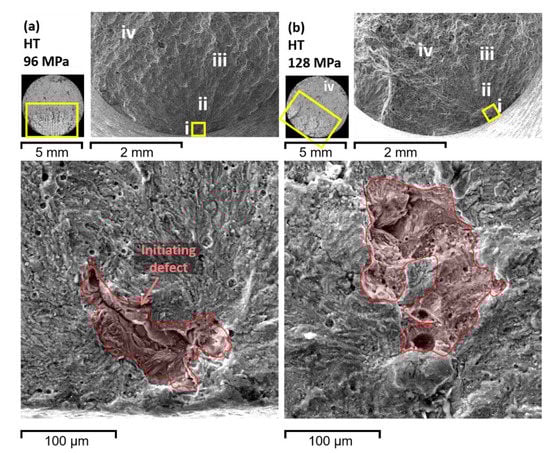 In order to describe better the connection between fatigue properties and features of the fracture surface, e.g., the size, type, and location of defects and the crack initiation and propagation regions, detailed fractography analyses were conducted. Fracture surfaces for two specimens in the NHT condition under Sa = 64 and 112 MPa (Figure 11) and two HT specimens under Sa = 96 and 128 MPa (Figure 12) were examined. The main zones of crack initiation (i), crack propagation (ii), transition area (iii), and final overload fracture (iv) can be observed clearly for all specimens. These zones have been observed in other studies as well [52,53]. The influence of applied Sa on all stages of fracture evolution can be seen, where at lower stresses the fatigue crack propagation and transition region are larger compared to the specimens tested under higher stresses.