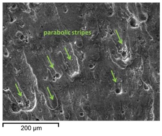 In the fatigue propagation region, a relatively smooth surface, due to repeated compression of the crack, can be observed. In the transition area between crack propagation and final overload fracture, parabolic stripes can be identified, signifying the propagation direction (see Figure 13). At the center of each stripe, a defect could consistently be found. These defects, which are away from the main initiating defect on the surface of the specimens, induce a minor crack initiation and propagation. These cracks can then merge to the main crack propagating on a different plane and form these small parabolic stripes [54].