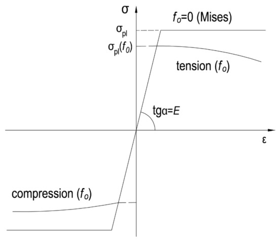 where is the critical voids volume fraction corresponding to the onset of their coalescence, and is the critical void volume fraction corresponding to the material failure. The identification of the last two parameters was an objective of the experiment and computational test in [21]. According to the fact that f0 is assumed here as the input Gaussian random variable, the plastic surface given by Equation (14) is no longer an ellipsoid but is bounded by two ellipsoids obtained for the upper and lower bounds for the probability density function of the parameter . The uncertain characteristic of this parameter modifies the meaning of inequalities inherent in Equation (7), which needs to include upper and lower bounds of the micro-voids volume fraction. It should be further mentioned that the constants included in (6) have been initially proposed in [22]. It has a better agreement with the localized shear bands bifurcations than those predicted by the initial Gurson model. In general, specific values of these coefficients have been calibrated by the additional experiments and have been taken here as equal to , , and [20,23]. It is obvious that the microvoids spatial distribution is uniform throughout the cross-section. It should be noted that Equation (6) may represent either ordinary yield condition, where f* is replaced by the current volume fraction f.