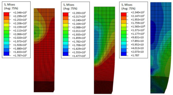 Reduced von Mises stress distribution (MPa) for f0 = 0.0000, 0.0012, and 0.0024.