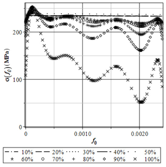 The final optimization of these local polynomial response functions are very sensitive to the efficient discretization of the whole domain. As is known from previous simulations, the FEM discretization has a negligible effect on the initial deformations in this necking bar, but on the other hand, a significant effect on the final configuration and possible damage of the extended specimen [20]. The influence of this discretization on the reduced von Mises stresses for various volume fractions of the initial micro-pores has been demonstrated in Figure 4. It is confirmed that these microdefects even with a relatively small volume ratio significantly affect the extreme stresses at the end of the deformation process. Figure 5 shows polynomial response functions for the extreme horizontal displacements as a function of the volume fraction of the voids existing in the material. Some response polynomials for reduced stress are given in Figure 6, and the numerical analysis progress in % is given in the legends of the figures. Such a presentation of the resulting polynomials with parameter f0 given in the X-axis is represented by some variations in the specimen initial voids, which is important in the further stochastic analysis based on partial derivatives with respect to the design input random parameter inherent in Taylor series expansions.