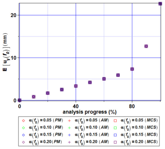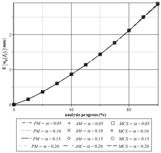 The most important part in this test was the determination of the basic probabilistic characteristics of extreme vertical displacements and of the reduced von Mises stresses as a basis for the reliability analysis according to the serviceability and ultimate limit states. This has been provided using three concurrent probabilistic techniques based on the same series of the FEM experiments. These were the Monte–Carlo simulation (abbreviated with MCS below), semi-analytical probabilistic technique (AM), and the generalized stochastic perturbation method (PM). The expected values, coefficients of variation, skewness, and kurtosis of extreme displacements have been collected in Figure 19, Figure 20, Figure 21 and Figure 22, while analogous probabilistic information concerning reduced stresses have been included in Figure 23, Figure 24, Figure 25 and Figure 26. These probabilistic characteristics have been computed for four different statistical scatterings of the input metal porosity α(f0) = 0.05, 0.10, 0.15, 0.20 to demonstrate the influence of the material imperfections uncertainty in this problem. The probabilistic characteristics of interest have all been plotted as functions of the analysis progress varying from 0 to 100% and observed for each 10%.