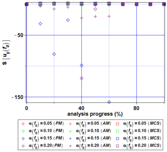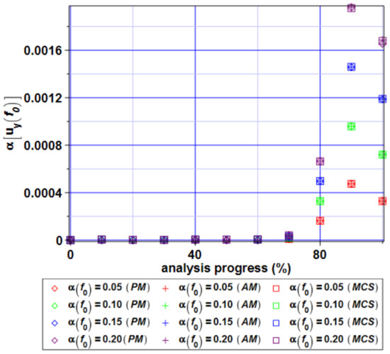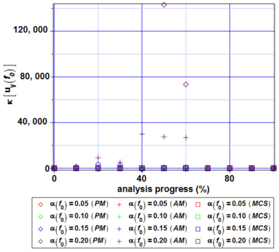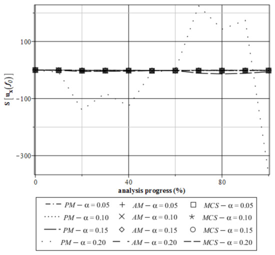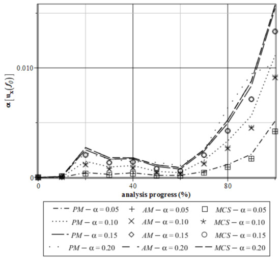 Almost the same perfect coincidence is obtained for the output CoV, whose values in both structural responses (cf. Figure 20 and Figure 24) are marginal. Nevertheless, an input uncertainty level starts to remarkably affect the resulting coefficients of variation when the analysis progress reaches 60–70%.