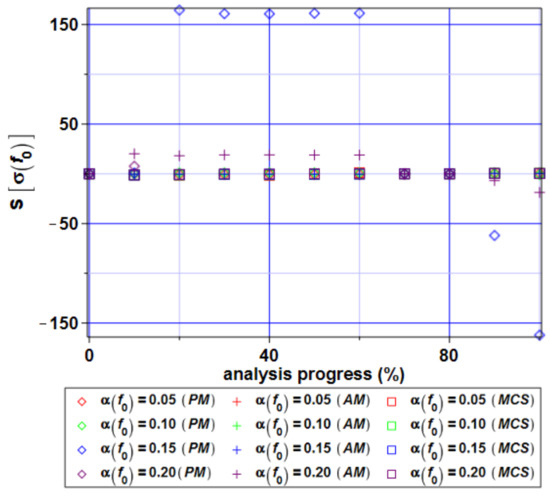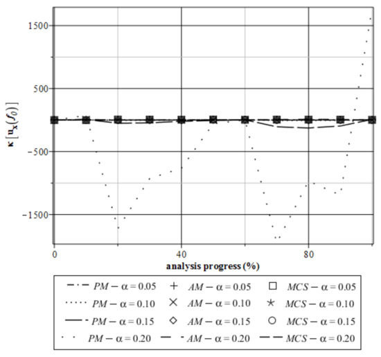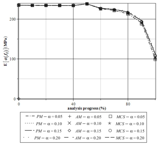 The numerical results section is divided into two parts; first, horizontal displacements are discussed from the statistical point of view, and then the stress analyzed. The expected values of extreme horizontal displacements ux are shown in Figure 7. Through the entire deformation process, displacements monotonously and almost linearly increase. All probabilistic methods coincide perfectly so that these expectations seem to be totally insensitive to the input coefficient of variation. Figure 8 shows the dependence between the input and output coefficient of variation of horizontal displacements in point A. It can be seen that the curves for all probabilistic methods are the same. At an analysis progress of 20%, a local extreme can be observed. The CoV takes values close to zero, which allows us to declare a Gaussian distribution of the deflection state function. Moreover, all output coefficients are about 10 times smaller than the corresponding input one. This confirms the expectations that are strongly concentrated around their means. It can be observed that the imperfect agreement between the statistical and nonstatistical approaches here is the most in the period after 80% of the analysis progress. This situation occurs for the largest input coefficient of variation α = 0.20, which causes some limitation on the perturbation technique here to not be larger than 0.10 when the expectations need to be precisely calculated. The skewness of horizontal displacements (Figure 9) maintain negative values during whole analysis. They are close to zero only if we input a narrow CoV α ≤ 0.05. This assumption is correct for all three conducted methods. For α > 0.05, the skewness tells us about the left-skewed distribution for this state function. Kurtosis of the extreme horizontal displacements of the specimen as a function of the parameter f0 takes both positive and negative values. The biggest negative values kurtosis (Figure 10) takes for perturbation and the Monte–Carlo technique is in the case where α = 0.20. This evidences the flat distribution of displacements in this range. For other values of the input coefficient of variation, all three methods give a kurtosis close to zero. If one bounds an input CoV with α ≤ 0.05, then we can approximate the distribution of this parameter as the Gaussian one.
