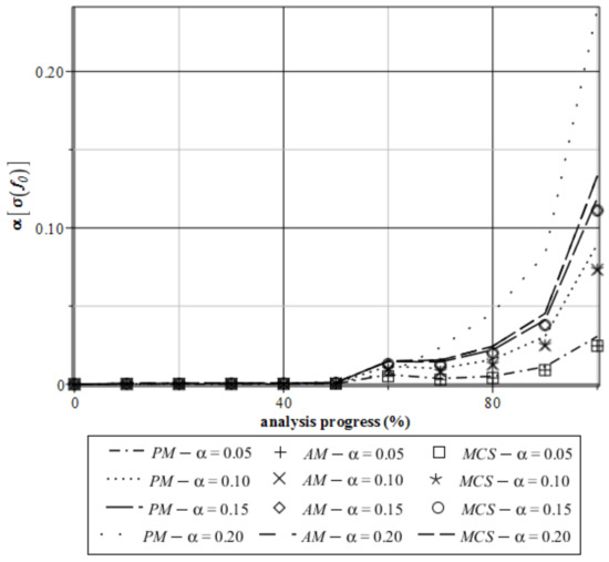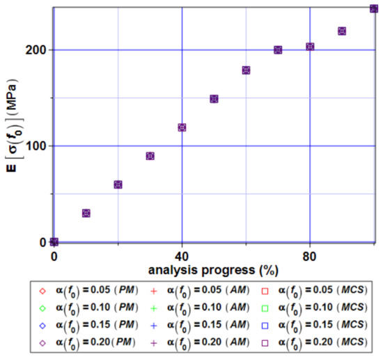 The second part of the computations involves the analysis of the distribution of the reduced von Mises stress. Expectations as a function of the volume fraction of voids existing in the material f0 are shown in Figure 11. Similar displacements for the stress analysis convergence of all three probabilistic methods can be observed. Moreover, we can say that the expectations are completely independent of the input CoV during most of the time of the analysis. After an analysis progress of 80%, small dispersions can be observed. The output coefficient of variation (Figure 12) of the extreme von Mises stress is independent of the used method and input CoV before half of the analysis. At the end of the analysis, the biggest impact of the input CoV can be seen; nevertheless, numerical values of the α[σ(f0)] are always smaller than input one. It tells us about the extreme concentration of expectations around its mean values.