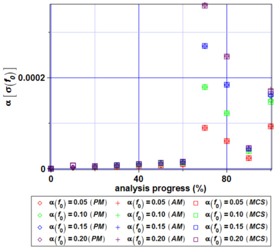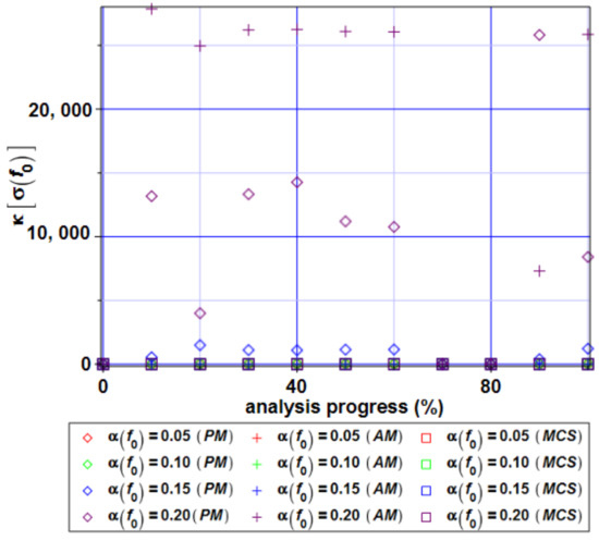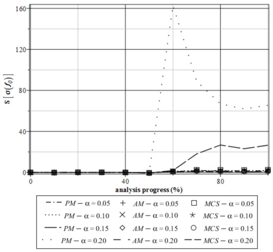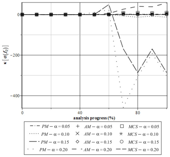 Taking into account the skewness distribution of the stress state function (Figure 13) we can observe a large fluctuation in the Monte–Carlo simulation and α = 0.20. In this case, the skewness reaches values over 60. This means that the range of the input coefficients of variation should be narrowed. The randomization of the initial voids existing in the material has not so large an influence on the skewness for all three methods before half of the analysis. After that, the skewness increases and always takes positive values. Therefore, the stress distribution can be defined as left-modal. Kurtosis of the reduced von Mises stress (Figure 14) shows analogous properties as the skewness. It generally demonstrates large fluctuations from 0 if α = 0.20 for the MCS and AM, but they have different characteristics for various random input variables. The random characteristics of the parameter f0 are best at the end of the analysis. Kurtosis κ[σ(f0)] takes positive and negative values for all three methods. Some fluctuations can be seen at the end of the analysis, but kurtosis is still close to zero. This indicates that expectations are concentrated about the mean values (Figure 11). SFEM analysis of the material with a randomness of its volume fraction of voids f0 also causes different results, so these models can be equivalent in some way, in addition to the correct prediction of the kurtosis of the examined extreme state functions. Analogously to the skewness, a satisfactory agreement of all three probabilistic methods is given if the input coefficient of variation is .