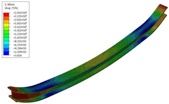 The reduced von Mises stresses map for the steel beam at the end of the deformation process.