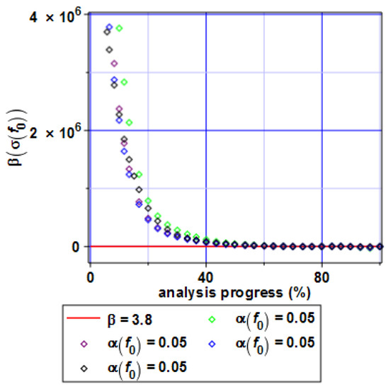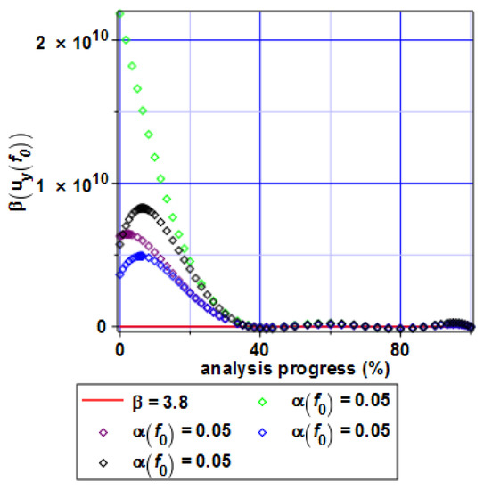 Probabilistic moments of the first and the second order have been combined into the reliability indices for the serviceability limit state (Figure 27) and, independently, for the ultimate limit state (Figure 28). They have been plotted in the same manner as above— for different uncertainty levels of the microvoids (α(f0) = 0.05, 0.10, 0.15, 0.20)—and also as a function of nonlinear deformation progress. The reference value depicted in Eurocode 0 has been inserted in both figures to determine the critical analysis level, where this structure can be qualified as unreliable. In both cases, the reliability indices decrease very fast together with the advancement of the uploading process in an exponential way in the case of the reduced stresses and with some initial variations, when the SLS is analyzed. Contrary to the previous diagrams, the influence of the material microvoids uncertainty is remarkable and some differences in-between the resulting indices β computed for various values of α(f0) are noticeable. It is seen that the critical state is the SLS here, where minimum admissible values of the reliability index is reached just before 40% of nonlinear analysis progress, while the ULS indicates a slightly larger steel I-beam capacity here. It should be underlined that the FORM reliability assessment usually brings more optimistic results than the SORM or higher-order methods [31], so the realistically admissible uploading level may be even smaller; however, the FORM approach has been applied and discussed here as the one included in the Eurocode 0 designing demands.