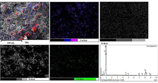 The interior of each sample was investigated using surface analysis techniques and chemical dispersion with SEM–EDS (energy dispersive spectroscopy) instruments after calcination. We found that each element was dispersed throughout the specimen, and more copper melted when the material was sintered at temperatures under 1250 °C. Thus, the melting of elements in the different electrodes at different temperatures is presented in Figure 5 and Figure 6. Figure 6 shows the chemical dispersion in the electrode, which was detected with the EDS pattern. The Cu–Ni–TiN electrodes and their elemental compositions were determined and analyzed to identify the electrode with the best properties. The analysis of the Cu–Ni–TiN electrode with the main elemental composition—Ti, Cu, Ni, and Co—revealed that Cu represented the dispersion of clusters, whereas Ti wasz found in the agglomerates of Cu. Conversely, Co and Ni were dispersed across the whole surface. Moreover, the Cu concentration decreased because of the melting and evaporation of Cu during sintering, whereas the Ti concentration increased due to the decreases in the concentrations of other elements. The results of the analysis of the dispersion of the elements in the Cu–Ni–TiN electrode specimens are presented in Table 3. Cu and Ti occurred in small compound particles that connect with Co and Ni; these particles were generated on the dispersed atoms throughout the whole sample during sintering [30,31]. In addition, the phase transformation of the Cu–Ni–TiN electrode was detected through XRD, which is displayed in Figure 7. Figure 7 shows the diffraction peaks of the Cu peak in the Cu–Ni–TiN electrode located at 2θ of 43.4, 50.5, and 74.1° (JCPDS No. 03-065-9743). Among the indicated diffraction peaks, 2θ was located at 24.1, 33.0, 41.0, 62.0, and 71.5°, which indicates the TiNi B2 crystal structure (JCPDS No. 00-003-1154). Based upon these XRD results, we concluded that the addition of copper resulted in the formation of the Cu-Ni-TiN B2 crystal structure from determination using the Scherrer equation to calculate average crystallite sizes (23.16 ± 0.46 nm). However, the oxide phases of Ti and Ni were also observed in the Cu–Ni–TiN electrode. This is probably the result of an incomplete reaction during the calcination process. The existence of this Cu–Ni–TiN B2 crystal structure (crystalline size particles) arose from the calcination conditions (more than 500 °C for 1 h at a heating rate of 10 °C/min), which were lower than in other studies [32,33,34]. The addition of nickel and titanium in a Cu electrode resulted in greater hardness properties compared with those of the pure Cu electrode as shown in the results of hardness (Figure 8) and the related density and porosity properties, which is discussed later on.