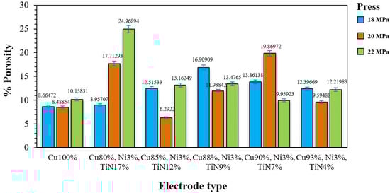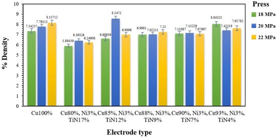 Analysis of the electrode density shows the effects of density on porosity. Electrodes with a high density have a low porosity because of the expansion that occurs during sintering, or the dispersion of other compounds, which results in a new phase in that area. However, other factors influence the electrode properties. Figure 10 shows that the 85% Cu–3% Ni–12% TiN electrode fabricated at a pressure of 18 MPa had the lowest porosity (6.2922%). Note that the porosity depends on the change in the shape of each metal powder and other electrode factors. Figure 11 shows the densities of the Cu–Ni–TiN electrodes. The values are similar, except for the 85% Cu–3% Ni–12% TiN electrode fabricated at a pressure of 20 MPa, which had the highest density (8.5472 g/cm3). The 80% Cu–3% Ni–17% TiN electrode fabricated at a pressure of 18 MPa exhibited a density of 5.89439 g/cm3. The different densities are due to the different properties and shapes of the metal powders, as well as the sintering process [37,38].