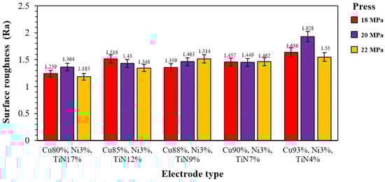 The average surface roughness of these materials under the sparked surface of the Cu–Ni–TiN electrode was found. The average surface roughness was minimal when the spark of the 80% Cu–3% Ni–17% TiN electrode obtained at 22 MPa was equal to 1.183 μm. The roughness depends on the amount of material between the discharge electrode and the workpiece [35,36,37]. The removal of the material with the spark causes the erosion of the surface, which leads to unequal surface roughness, as shown in Figure 14.