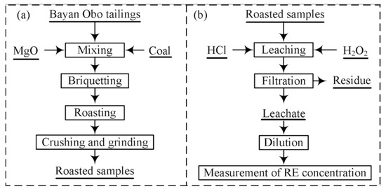 Flowchart of the experimental procedure. (a) roasting procedure, (b) leaching procedure.