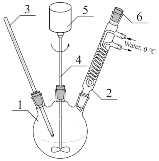 Schematic diagram of the three-necked flask for leaching. 1-three-necked flask, 2-condensing return tube, 3-glass thermometer, 4-agitator, 5-electric motor, 6-plug.