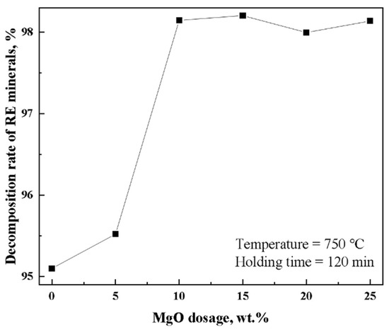 The effect of MgO dosage on the decomposition rate of RE minerals was investigated with a constant roasting temperature of 750 °C and hold time of 120 min, the results were summarized in Figure 3. As the dosage of MgO raising from 0 to 10 wt.%, the decomposition rate increased from 95.1% to 98.1%. Further increase in the MgO dosage beyond the stoichiometric requirement did not enhance decomposition rate, but increased the cost. Therefore, the dosage of MgO in the following experiments was fixed to 10 wt.%.