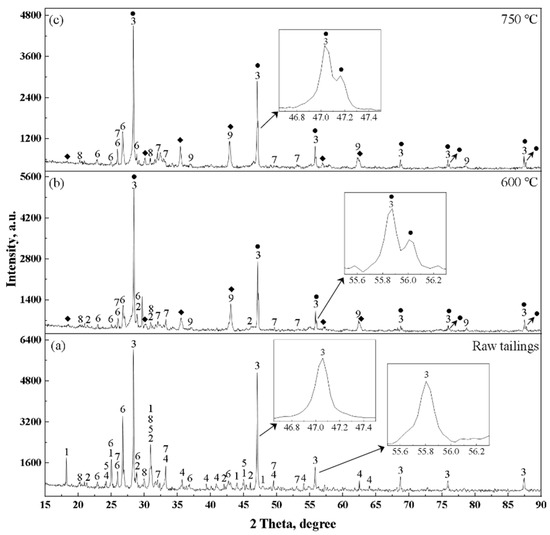 The XRD patterns of the raw tailings and the samples roasted at different temperature are shown in Figure 4.