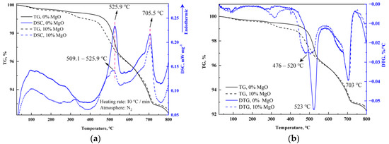 TG-DSC analysis of the samples without and with addition of MgO: (a) TG-DSC curves, (b) TG-DTG curves.