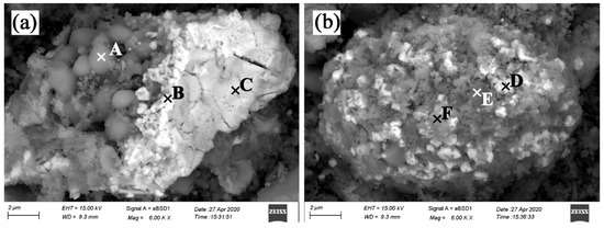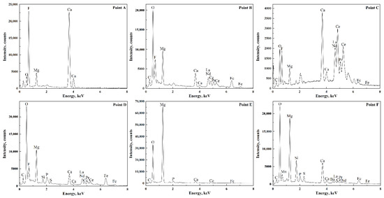 Figure 6 and Figure 7 and Table 2 show the SEM-EDS results of the sample with 10 wt.% MgO roasted at 700 °C for 120 min. Figure 6a shows that RE oxides (marked as “C”) were attached to CaF2 particles (marked as “A”). The EDS analysis results of points “B” and “C” exhibit the presence of Mg and F, which may be due to the reaction shown in Equation (2) [11,16]. The particle shown in Figure 5b is the aggregation of MgO and RE oxides. P and F were detected at points “D” and “F”, which are from the reactions shown in Equations (3) and (4) [12,16]. Also, CaO from the decomposition of CaMg(CO3)2, as shown by Equation (5) [17], led to the reactions shown as Equations (6)–(8) [10,17,18]: