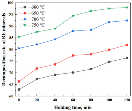 The effects of roasting temperature and holding time on the decomposition rate of RE minerals were investigated with a constant MgO mass ratio of 10 wt.%. The holding time for roasting varied in the range of 0–120 min. The results are presented in Figure 8, showing that the decomposition rate increased with the temperature and holding time, respectively.