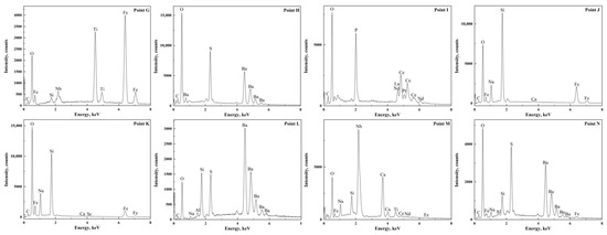 With the hold time of 120 min, the maximum decomposition rates at 600 °C, 650 °C, 700 °C, and 750 °C reached 76.45%, 81.97%, 92.44%, and 98.09%, respectively. It should be noted that the decomposition rates for all the cases exceeded 60% during the temperature-rising stage. The SEM-EDS results of the leaching residues are shown in Figure 9 and Figure 10 and Table 3. The BaSO4 particles (marked as “H”, “L” and “N” in Figure 9) and the Na(Fe, Sc)Si2O6 particles (marked as “J” and “K” in Figure 9) were detected in all leaching residues. The particles marked as “G” and “M” in Figure 9 contain Nb, Ti, Fe, Ce, Nd, and Ca, which belong to niobium minerals such as pyrochlore-group(Ce2Nb2O6(OH)2), ilmenorutile ((Ti, Nb, Fe)O2), and eschynite (CeTiNbO6), according to the study of Zhang et al. [19]. These undecomposed niobium minerals are the reasons for the decomposition rate of RE minerals not reaching 100% at 750 °C. While the reason for the low decomposition rate before 750 °C is the undecomposed REPO4, which was observed in the sample roasted at 600 °C, as shown by the particles marked “I” in Figure 9b.