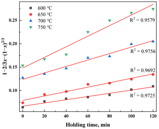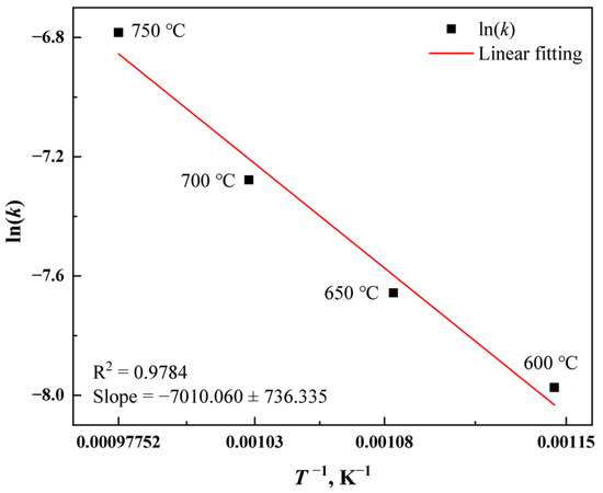 The experimental data from Figure 7 were used for the calculation with Equation (9), and the results were plotted in Figure 11. The linear results with the fit coefficients closing to 1.0 suggest that the thermal decomposition process of the RE minerals in tailings follows Ginstling-Brundshtein model. The values of k were equal to the slope of the fitted line in Figure 11. Subsequently, the activation energy Ea was determined via plotting ln(k) versus inverse temperature 1/T according to the Arrhenius relationship given in Equation (10):