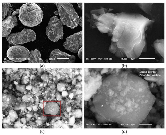 SEM images of (a) a commercial Ce inoculant powder; (b) flakes of the graphene nanopowder; (c) mixture of the two powders after mixing for 20 h; (d) magnified image of the mixture showing how the nanopowder welded on the surface of the commercial inoculant particle.