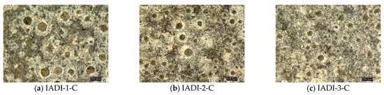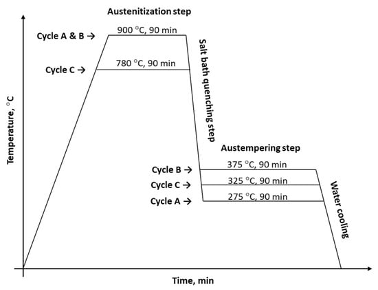 Three different austempering heat-treatment schedules (see Figure 3) were applied to the produced cast alloys. The heat-treatment processes were started by heating the research samples using an electric resistance furnace to reach the austenitizing temperature. Subsequently, all the samples were quenched in a salt bath furnace for achieving the targeted austempering temperatures. Finally, the research samples were quenched in water to room temperature.