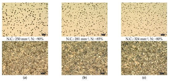 Figure 4 illustrates the microstructure (non-etched and etched micrographs) of the three developed ductile iron alloys. The microstructure of the three casting alloys consisted of well-spheroidized graphite in a pearlitic matrix (~80%) and a limited ferrite content (~10%) in the form of a thin halo surrounding the graphite spheroids. By increasing the niobium content in the alloy to 0.1 wt %, the nodule count (N.C.) of the graphite increased from a level around 250 mm−2 to more than 320 mm−2, but it concurrently decreased the nodularity (N) from 90% to around 80% when the Nb amount reaches 0.1 wt %. Fraś et al. [26] studied the effect of small additions of niobium (up to 0.038 wt % Nb) on the structure and mechanical properties of ductile irons. It was indicated that small addition of Nb slightly decreased graphite nodule count and increased the fraction of carbides in the matrix, although the effect of small additions of niobium on the type of the matrix was negligible.