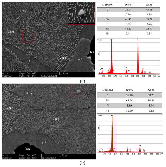 SEM micrographs and EDS analysis of the Nb microalloyed ductile iron alloys, (a) DI-2, 0.05 wt % Nb, (b) DI-3, 0.1 wt % Nb; G: graphite, F: ferrite, CPZ: coarse pearlite zone, FPZ: fine pearlite zone. SPZ: spheroidized pearlite zone.