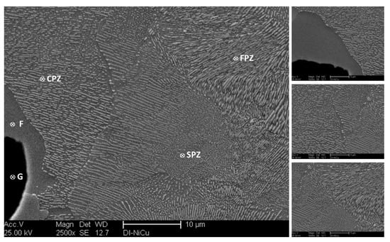 SEM micrographs of the Ni–Cu-modified ductile iron alloy, DI-1; G: graphite, F: ferrite, CPZ: coarse pearlite zone, FPZ: fine pearlite zone. SPZ: spheroidized pearlite zone.