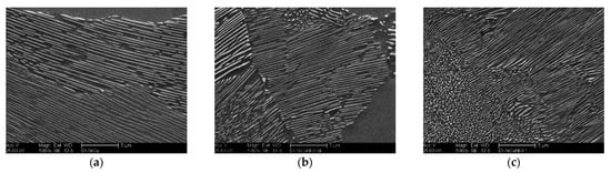 Magnified SEM micrographs showing the pearlite structure of the developed ductile iron alloys; (a) DI-1, 0 wt % Nb, (b) DI-2, 0.05 wt % Nb, (c) DI-3, 0.1 wt % Nb.