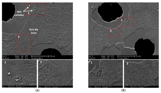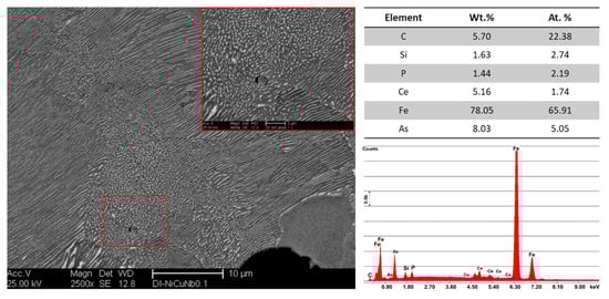 Nb microalloyed ductile iron alloys, DI-2 and DI-3, showed different sizes and morphology of niobium carbide particles. With a view to identifying the nature of these precipitated, EDS analysis was conducted (Figure 5). Nanosized NbC particles were observed in the 0.05 wt % Nb alloy (see Figure 5a, marked by the red rectangle). By increasing the Nb content to 0.1 wt %, the size and volume fraction of the NbC particles increased. (NbC primary carbides with a size of 3.5–4.0 µm were observed in the ductile iron alloyed with up to 0.1 wt % Nb (see Figure 5b). The EDS analysis revealed Ti. Indeed, both ductile irons contained Ti, an impurity of 0.005 wt %. The Ti remains as an accompanying element in the NbC. According to the thermodynamic calculations with ThermoCalc, this impurity level of Ti was reflected in the chemistry of NbC particles in an amount of 7.9 wt % in DI-2 and 4.3 wt % in DI-3. The predicted Nb and C contents were 79.5 wt % and 12.3 wt %, respectively, in DI-2 and 84.0 wt % and 11.7 wt %, respectively, in DI-3. The Fe was predicted to had a negligible quantity in NbC. The source of Fe in the analyses of Figure 5 was the matrix, therefore, decreased the accuracy of the analyses. Transmission electron microscopy (TEM) analysis was carried out by Chen et al. [22] and Fraś et al. [30] on Nb-microalloyed ductile irons. The TEM analysis revealed that nano and microsized carbide precipitated formed in the matrix, acting as a nucleation site for graphite nodules.