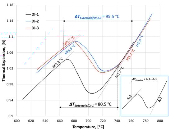 The influence of the niobium additions on the eutectoid temperature was investigated using the dilatometric experiments (described in Section 2.2). The three investigated ductile iron alloys were cooled from 950 °C with a slow cooling rate of 0.2 K/s. After reaching the target temperature, the samples were held for 15 min, and then slowly cooled at 0.2 K/s. The relative expansion of the samples was determined based on the following Equation (1):