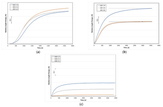 Figure 12c depicts the ausferrite transformation curves for the investigated alloys after the intercritical austenitizing at 780 °C and austempering at 325 °C. It is obvious that the three alloys provide lower dilatation values compared to the other mentioned austempering heat-treatment cycles in Figure 12a,b. The presence of proeutectoid ferrite in the matrix in addition to the small amount of ausferrite formation explains the lower dilatation values for the intercritically annealed austempered ductile iron (IADI) samples. Furthermore, the intercritical austenite formed at 780 °C was predicted to contain 0.50 wt % carbon, whereas that formed by annealing at 900 °C was predicted to contain 0.75 wt % of carbon. The lower hardenability of the intercritically annealed austenite resulted in an additional motivation of the ausferrite transformation kinetics.