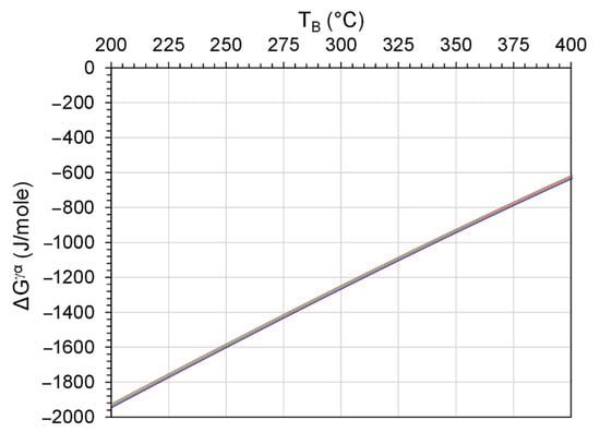 Driving force of ausferrite formation transformation, ΔGγα of the three ductile irons (the curves of the three irons are almost coincident). The calculations are based on the composition of austenite at 900 °C.