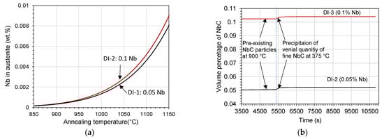 (a) Predicted dependence of the dissolved Nb in austenite on the annealing temperature and (b) predicted development of volume percentage of the NbC particles during annealing at 900 °C and austempering at 375 °C of ductile irons DI-1 and DI-2.